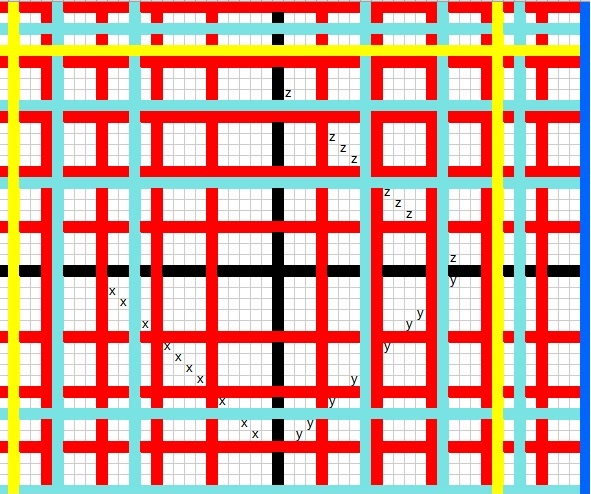 Dans le schéma précédent les axes sont en noir et on élimine de la table les sommes associées à un « x » ou un « y » codes d’entiers non premiers.