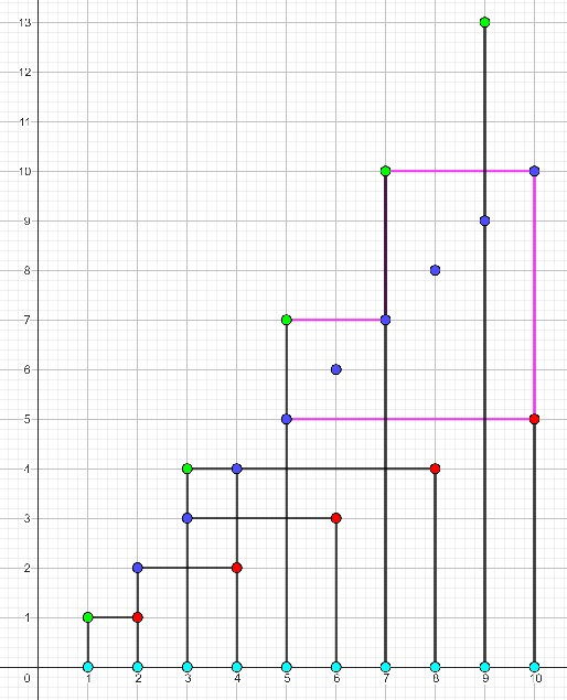 Dans une suite de trois lignes bleues à gauche on a un antécédent vert à droite